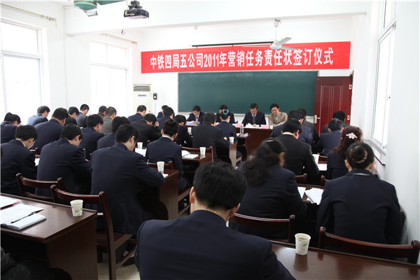 2月25日,中铁四局五公司2011年营销任务责任状签订仪式在总部举行。公司领导贾恩增、汪海旺、王闽建、狄为民和职业项目经理李文峰,以及公司经营部全体员工、经营性办事处主任共聚一堂,共话企业营销发展工作。