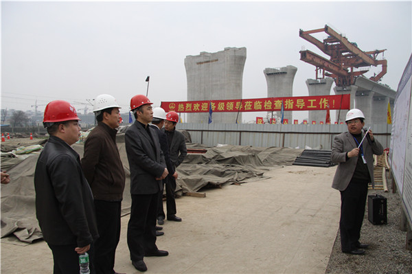 在跨桂红路连续梁施工现场,检查组一行认真听取了李辉关于公司成绵乐管段施工生产的专题汇报。项目标准化管理推进、重点工程的安全质量防控措施得到了检查组一致肯定。随后,检查组又驱车来到跨既宝成线系杆拱施工现场。范树江对跨既有线施工立体防护给予了高度评价。他说:“四局在跨既有线施工上有着丰富的经验,施工方案严谨、安全措施到位。这种立体式安全防护有效的保证了施工安全,应在全线跨既有线施工中予以推广”。