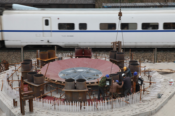 转体梁球铰施工(吴健/摄)