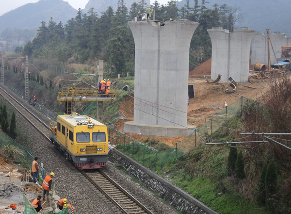 施工中,为贯彻落实铁道部“保安全 保质量 保稳定 促发展”方针,七工区制定四项措施掀大干。一是周密制定既有线施工方案。湾仔特大桥施工环境复杂,多为岩溶发育地区,18#—19#两墩两侧承台边与既有铁路最小距离仅为3.7m,并有一段高度落差,下面行驶快速动车,为此,七工区多次召开专题会议,合理组织施工方案。二是确保施工安全。七工区三管齐下制订安全可行的施工计划,首先加强岗前安全培训教育,作业人员培训不合格不上岗;其次加大安全施工防护力度,每月提前与南昌铁路局工务段等设备关联单位进行协调,签订既有线安全施工配合协议,委托南昌工务段宜春巡养车间每日对既有线巡查和路基岩溶勘察,对接触网回流绝缘。并专设了驻宜春站联络员和现场三班倒安全防护员和群众安全监督员,驻守在墩位旁边;第三强化安全文明施工。采用彩钢板临时围挡全封闭施工,场地内做到道路畅通、平坦、整洁,排水通畅,各种安全标牌齐全,并设置了安全宣传栏,现场安全生产氛围好,同时在现场堆码应急材料,诸如道渣、起道器、钢护筒、片石等,加强预警机制。三是加强技术配合和监测,每日技术组对线路稳定进行测量观测;四是现场盯班,确保施工进度。工区领导轮班进行夜间施工巡查和蹲守,跟班作业盯控,尽量缩短施工时间,协作队伍员工加班加点,快速施工,从而确保了湾仔特大桥跨既有线桥墩的安全顺利完成,减轻了工区安全生产压力,打开了铺架施工“瓶颈”。