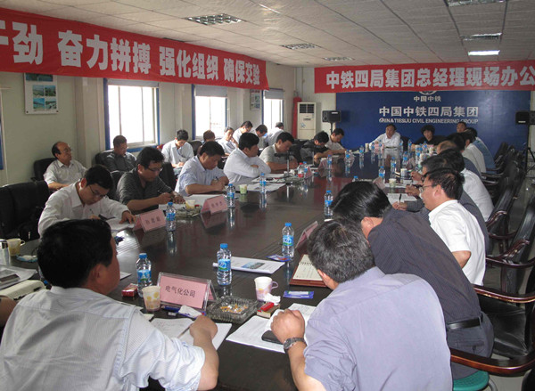 4月12日,中铁四局总经理现场办公会在该局五公司深圳地铁5号线经理部会议室召开,四局总经理许宝成、总经理助理邓民出席会议,全面部署深圳地铁项目建设工作,对地铁项目建设提出安全优质建设,绿色环保施工,打造中铁标杆企业良好信誉。