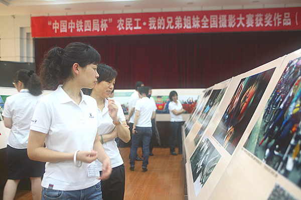 6月1日,“中国中铁四局杯”农民工o我的兄弟姐妹全国摄影大赛获奖作品在江西九江布展,中铁四局五公司总经理汪海旺、纪委书记朱钢、工会主席李会兴、总会计师耿天宝等在家领导,五公司九江片区员工以及前来公司参加业务培训的人员参观了展览。