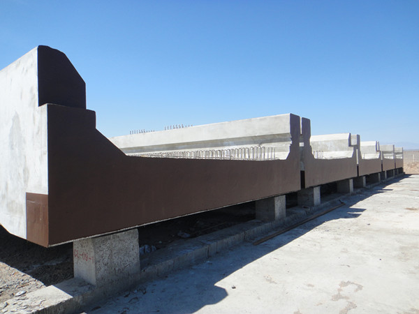 四局哈密制梁场承担兰新铁路第二双线Ⅳ标204孔(408片)16m槽形梁的预制和架设任务。槽形梁生产区配置钢模板12套,制梁台座12个,存梁台座98个。制梁场成立科研攻关小组,分别于2010年12月23日和2011年5月28日,在不同的时间段及外部气温、风力等环境条件下,试生产出槽形梁,取得槽形梁模板设计、移动式绑扎胎具设计、混凝土浇筑、养护施工工艺、配合比设计、静载试验架设计等方面技术参数。