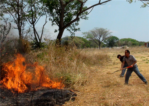 委内瑞拉分旱季和雨季,全年属于高温气候,旱季百草枯竭,燃点较高,容易自燃,又由于热带雨林长青灌木的阻挡,一般野火均能自生自灭。这天下午2点,迪那科主营地外,烟熏火燎,风势较大,起火点迅速从几个扩充至几十个,火借风势,风助火威,过火面积不时扩大到上百米,并且有突入营地的可能。而营地内,堆放了诸多设备和材料,得到火警后,五公司委铁经理部立即从营地调出设备开挖防火带,组织人员全力灭火,闻讯赶来的迪那科消防队员也投入了灭火行动,经过中委双方通力合作,蔓延的大火被阻挡在营地栅栏之外,于隔离圈燃尽而息。此前,该经理部曾组织实施了栅栏内防火隔离带的分割工作。本次突发火情后,经理部在营地栅栏外清除了杂草、挖出了两米宽的隔离带,确保整个旱季野火难以侵入主营地。