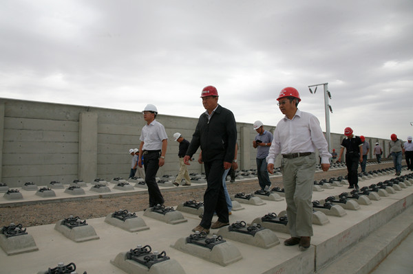 “自2009年11月19日兰新铁路第二双线新疆段开工动员至今,无论是前期防风工程大干,还是无砟轨道首件段验收,各标段都付出了巨大努力,尤其是今天被观摩的工区为全线做出了标准……”6月30日,兰新铁路新疆有限公司组织的全线观摩在中铁四局兰新铁路第二双线三工区一队无砟轨道成型段进行总结评价,并要求各标段以被观摩段标准为样板,切实安全优质建好兰新工程。