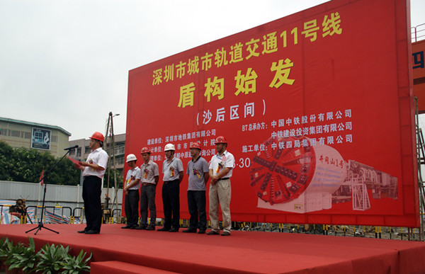 深圳地铁公司、中国中铁投资有限公司、监理、设计、中铁四局深圳地铁11号线指挥部等单位代表出席了中铁四局五公司首台盾构“井冈山1号”始发仪式。