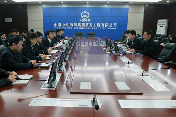 4月10日,中国中铁股份公司新闻中心主任、政研会秘书长曹艳春,政研会副秘书长康平,中铁四局宣传部副部长王传七一行三人来到中铁四局五公司,就企业管理创新工作进行调研并座谈。五公司党委副书记何宝柱、总会计师沈孝祥以及各部门负责人与会。