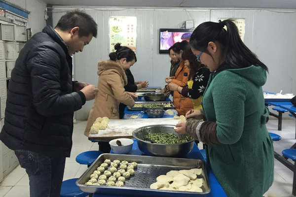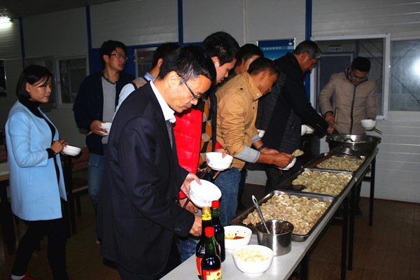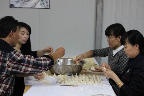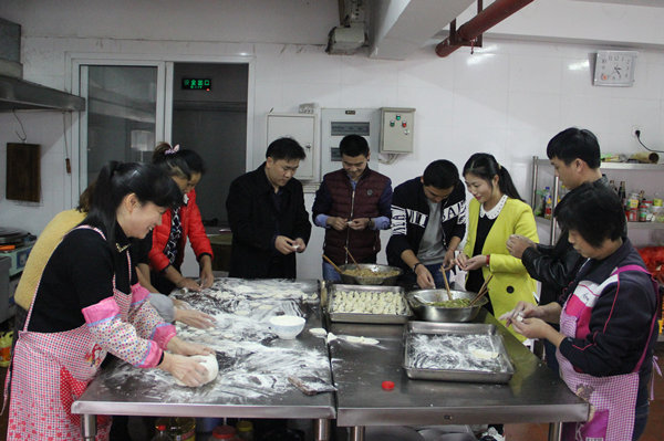 下午15时30分,五公司总部员工们安排好手头工作,来到职工食堂包饺子,同时品味劳动带来的快乐。一阵忙碌的准备后,大家围在餐桌旁有说有笑地开始劳动,有人和面、有人擀皮儿、有人包饺子,分工明确又配合默契。不一会儿,一盘盘形式多样、样貌精美的饺子便摆上圆桌,大家纷纷与自己的劳动成果合影留念,欢声笑语衬托出浓浓的节日气氛。晚上,全体员工嘴里吃着热腾腾的饺子,讨论着各自家乡过冬至的习俗,整个职工食堂暖意融融。