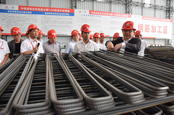 11月19日,中铁四局五公司项目现场管理观摩暨标准化研讨会首站走龙怀高速公路TJ25标项目。五公司总经理李辉、总经济师狄为民、副总经理欧阳垂礼、总工程师汪家雷、副总级项目经理甘百文,公司工程部、安质部、技术中心、中心试验室、物资部、机械部、宣传部、工会等部门负责人及公路项目标准化手册具体编制人员,各公路项目经理、总工程师一行40余人对龙怀高速公路TJ25标项目跨京广高铁转体梁、墩柱群施工及制梁场和钢筋加工厂等进行了实地观摩,并共同参与了公司《公路项目现场管理标准化手册》研讨。会议一致认为应该加大公司现场管理标准化推行力度,尽快推出公司铁路、市政地铁、公路等相关《现场管理标准化手册》。