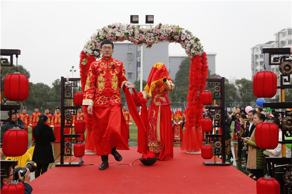 上午10点08分,伴着喜庆的彩带和现场的掌声,11对新人穿着中式结婚礼服,手挽着手跨过幸福之门和火盆,来到婚礼舞台中央,拉开了一场古典浪漫的中式集体婚礼序幕。在大家的见证下,新郎用吉祥秤杆一看唇、二看鼻、三看眉,并挑开新娘头上的盖头,新郎新娘一起拜天地、拜双亲、夫妻对拜,并共饮交杯酒,许下执手共此生的承诺,互换信物——婚戒,寓意婚后同心同德、幸福美满、白首偕老。