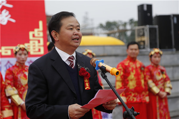 五公司工会主席兼副总经理王闽建代表新郎、新娘及双方父母致证婚词,祝福新人白首齐眉鸳鸯比翼,青阳起瑞桃李同心,宣布了参加今天集体婚礼的11对新人符合法定年龄、办理了完备的结婚登记手续,他们的恋爱是真诚的、爱情是甜蜜的、婚姻是合法的,并为新人们送上了祝福。