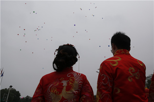 五公司党委书记、执行董事卢志刚,工会主席兼副总经理王闽建,总会计师沈孝祥,调研员李会兴分别为11对新人派发了象征吉祥、幸福的礼物,并分别向新人贺喜、与新人留影。最后,参与11对新人幸福见证的现场亲朋好友、同事们一同放飞了象征和平、吉祥与幸福的多彩气球,向大家发放了喜糖。至此,整个简单而隆重的婚礼仪式圆满礼成。