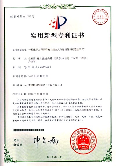 近日,从国家知识产权局传来喜讯,由中铁四局五公司研发的“一种地下工程顶管施工组合式顶进钢管间的连接装置”获国家实用新型专利。