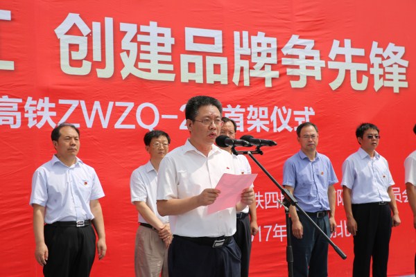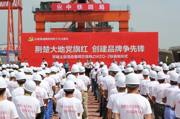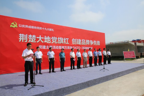 为进一步推进郑万高铁施工,建设中国高速铁路标准化管理示范工程。7月10日,中铁四局“荆楚大地党旗红 创建品牌争先锋”党建主题活动暨郑万高铁湖北段首架仪式,在中铁四局郑(州)万(州)高铁2标白河制梁场举行。