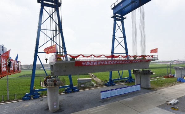 郑万高铁湖北段首片箱梁架设(唐生林/摄)