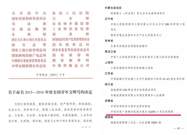 日前,共青团中央下发文件,中铁四局五公司广(州)清(远)城际1标项目经理部荣获2015-2016年度“全国青年文明号”,这也是该公司首次获此殊荣。