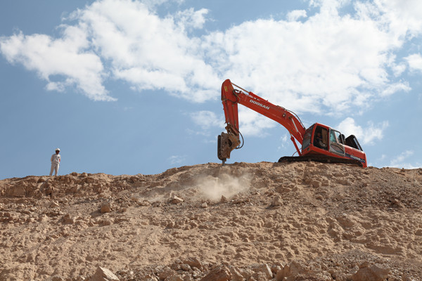 大型“啄木鸟”进行大挖方段边坡凿岩施工(张召/摄)