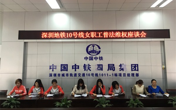 深圳地铁10号线经理部召开了“三八节”女工维权座谈会,8名女职工学习了《安徽省女职工劳动保护特别规定》和公司女职工特殊权益专项保护协议;同时,与会人员融洽的气氛中畅所欲言,释放了平时工作和生活中承受的压力,女职工万文君深有体会的说:“作为中铁四局的女员工们要发挥出“半边天”的作用,公司的发展尽自己的一份力量。”(饶正春 王璐)