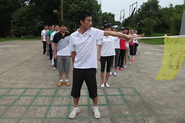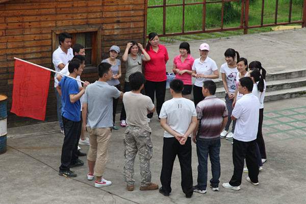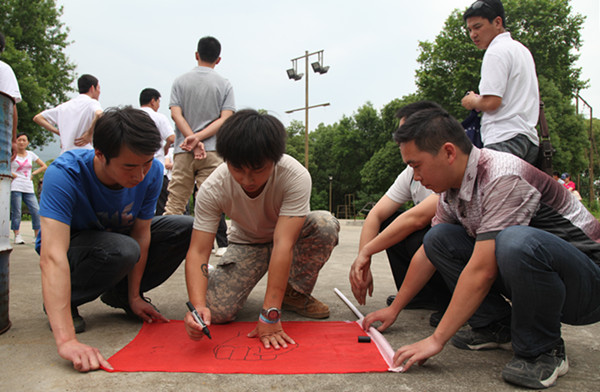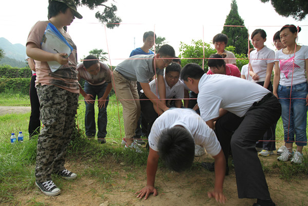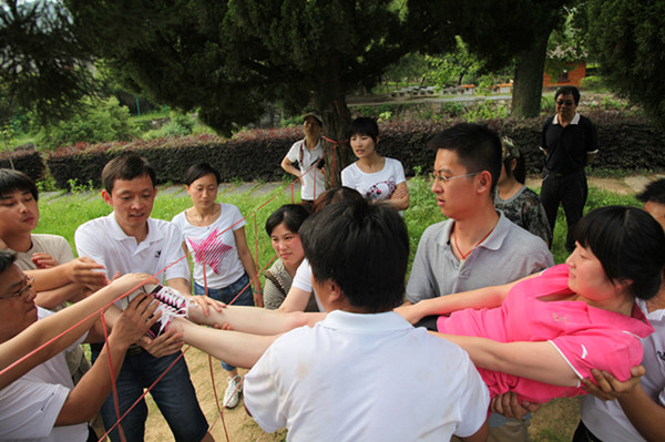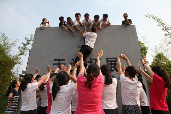 另一项拓展运动是翻越四米二高的逃生墙,光秃秃的一面水泥墙,没有任何可攀沿的外界借助物。不,不对,我们有团队的力量!几名身手矫健的男队友先行攀到了逃生墙上,而后,所有的女队员们借着男队友的肩膀做阶梯,与墙上的队友们双手相扣在彼此的手腕上,结成“生死扣”,被借力上行,成功翻越。而不论是还没有开始翻越的队友,还是已经逃生的队友,无一不在墙下张开双手,做好随时迎接失败或胜利的队友们。“生死扣”是在共度难关时把生死交给对方的一种救护拉手方式,如此牢固,如此信任。此时,一个把自己的生命完全信任的交给了对方的队友,在团队的奋力协助下成功逃生。当地面上只剩下最后一名队友时,已经翻越过去的两名队友以“金钟倒挂”的方式,与地面的队友结成“生死扣”,借助其他队友搭成的稳固的协作链的力量,攀越了生死墙。信任和协作让我们大获全胜,38人在短短的12分钟内完成了任务。
