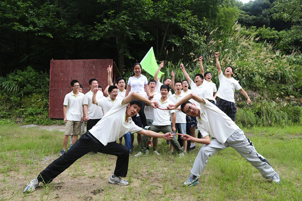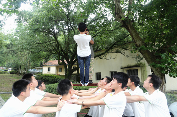 是日上午,在教练的指导下,新加盟大学生分成三组进行军训,并各自设计了队名、队训、队徽和队歌。随后,队员先后挑战了“信任背摔”、“高空断桥”及“生死电网”等项目。在“信任背摔”中,挑战者在双手被缚的情况下从2米左右的高台上向后仰摔,其余充当保护者的队员用手臂搭起人床接住挑战者,整个游戏过程中让大家体会到了信任的重要性。“高空断桥”需要挑战者爬至10米的高空,横跨1.2米宽的距离,大部分队员都能克服心理恐惧,迅速完成,同时当部分队员犹豫不前时,大家也纷纷为其鼓劲加油,现场充满团结气氛。“生死电网”的挑战颇为困难,队员们只能用肢体语言对话,将一名名队友穿过窄窄的“电网”抬到对面,“触电”就会重来并接受全员惩罚。员工们在面临挑战时齐心协力,充分集中智慧,最终圆满通过考验。