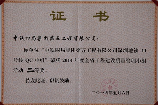 5月5日~6日,江西省2014年工程建设优秀质量管理小组活动成果交流会在南昌召开,我公司深圳地铁碧头站经理部“深圳地铁11号线QC小组”荣获2014年度全省工程建设质量管理小组活动二等奖。